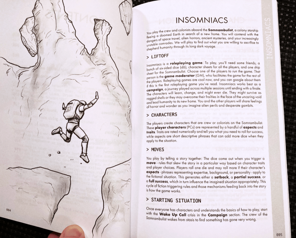 Insomniacs is a cryoship starcrawl game that evokes existential horror and cosmic wonder in equal measure. It takes a general approach similar to many PbtA designs, finds inspiration in Forged in the Dark, and owes a heavy debt to Fate.